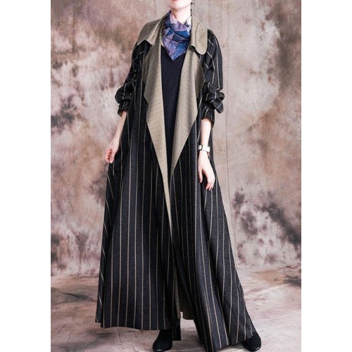 Elegant plus size long fall coat black striped Notched large hem wool overcoat